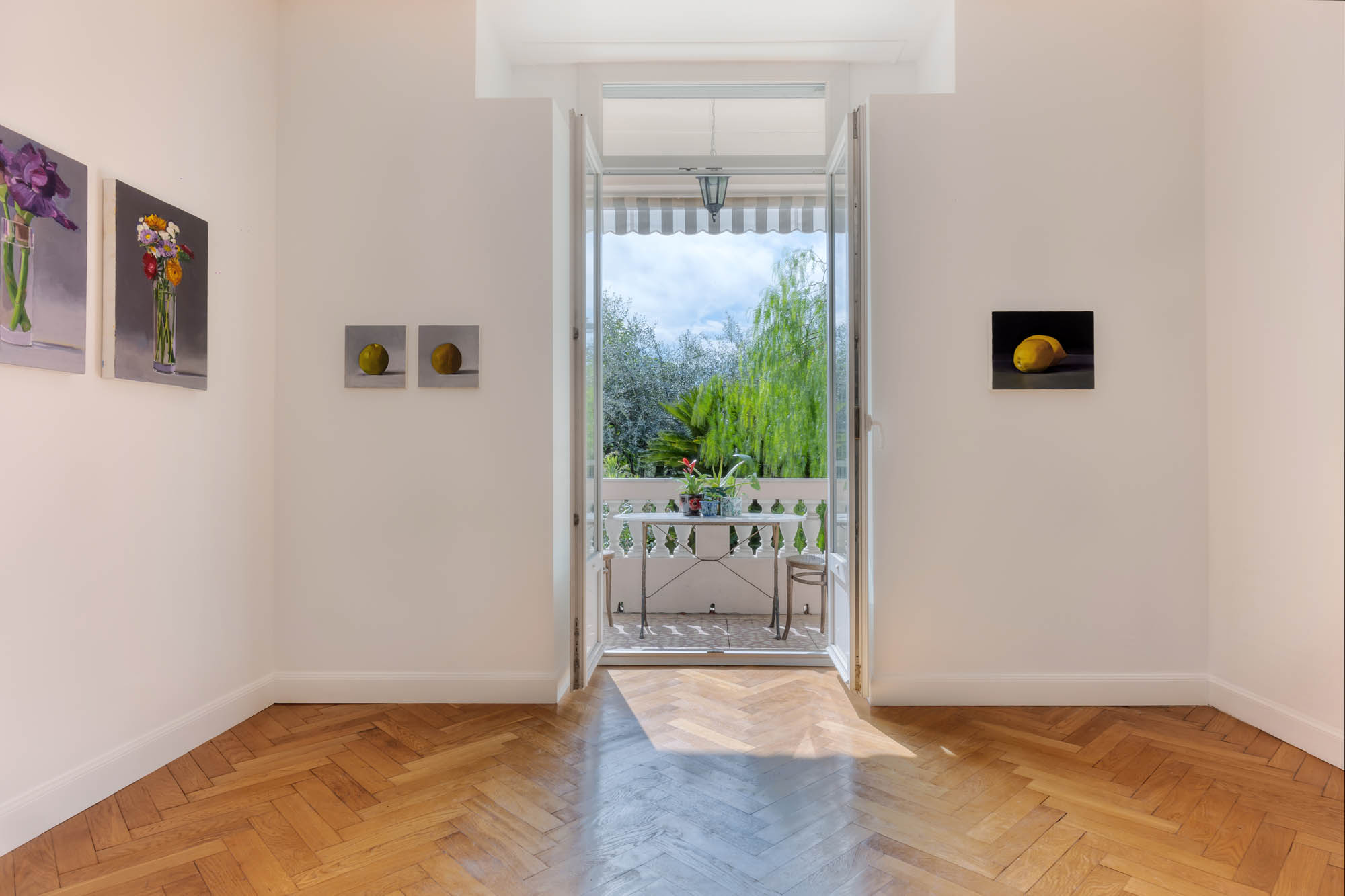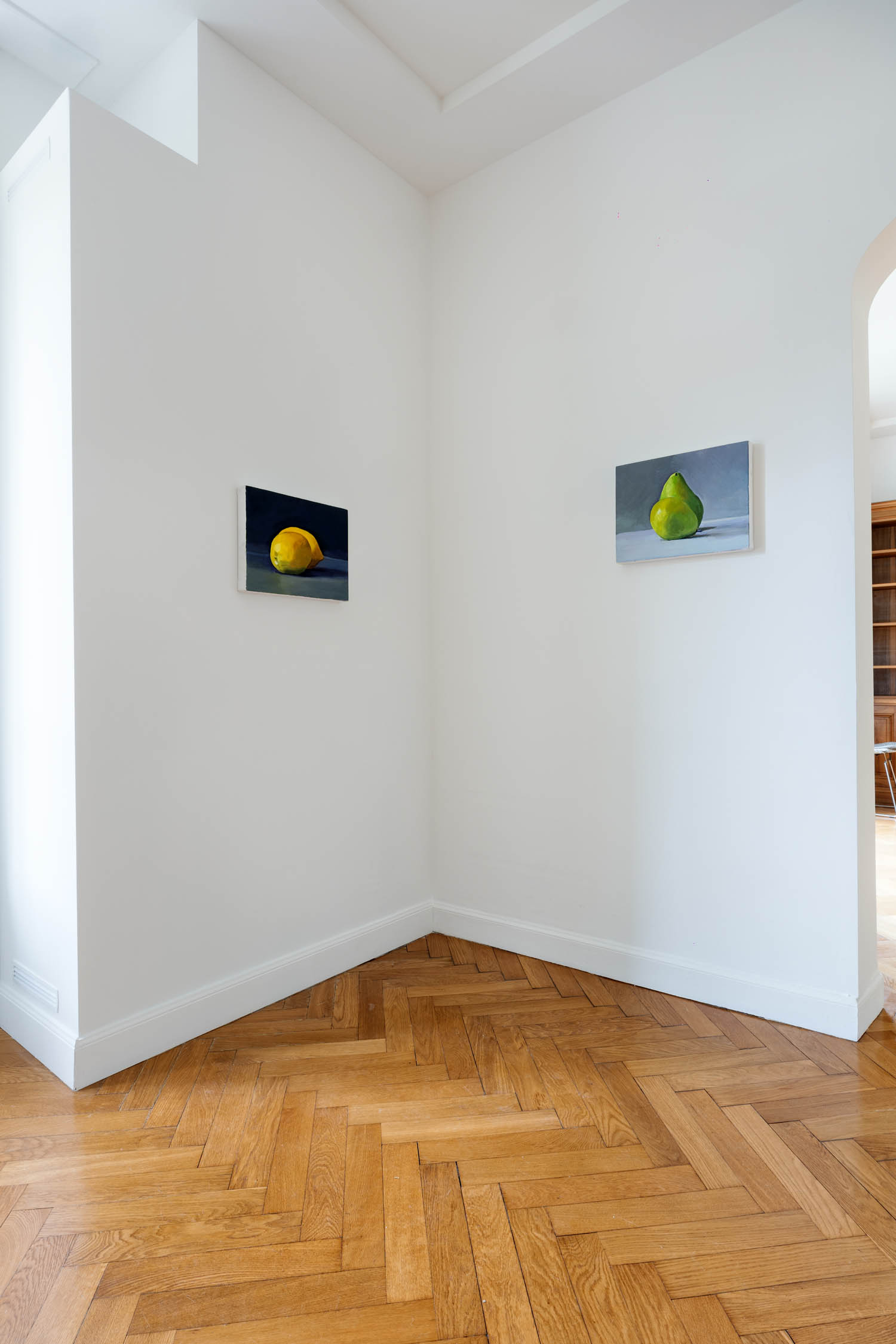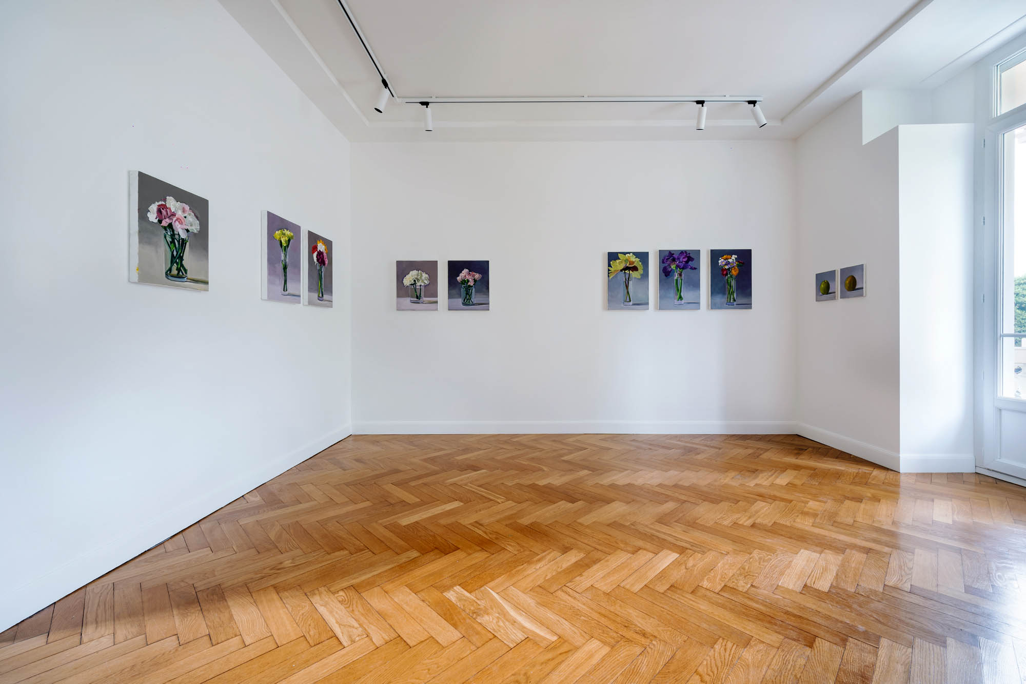 McCleary’s still-life paintings offer a meticulous exploration of form and color. The exhibition presents thirteen intricate floral compositions alongside four smaller fruit studies, each crafted with a minimalist beauty that invites a deep, contemplative gaze. The work pays homage to traditional genre painting, yet McCleary brings a contemporary edge, subtly reinterpreting timeless themes with deadpan precision and a quiet yet resonant emotional power. Every brushstroke is purposeful, stripping the subject to its essence, whether it’s the soft suggestion of a lily or the simple curve of a pear.