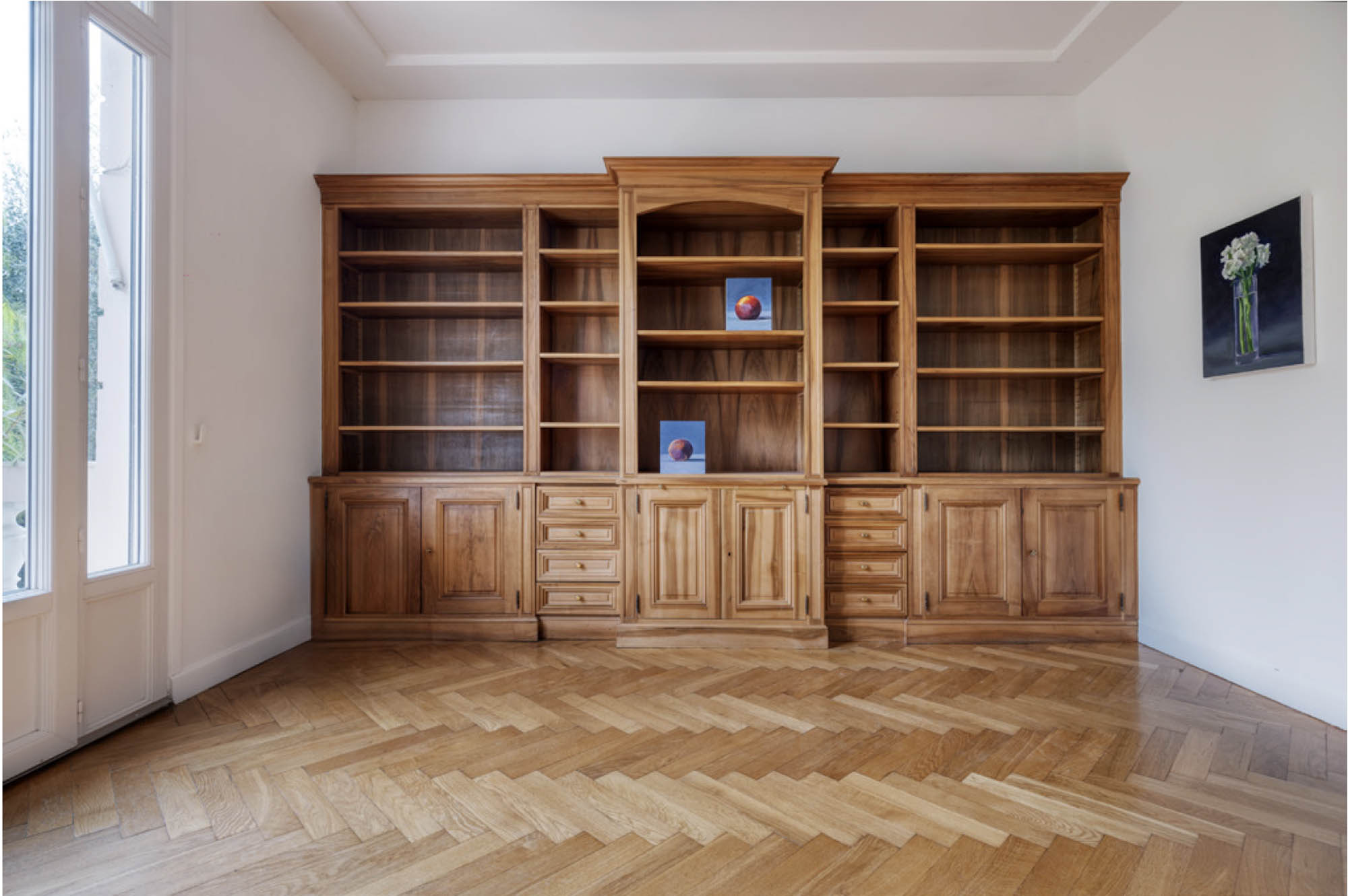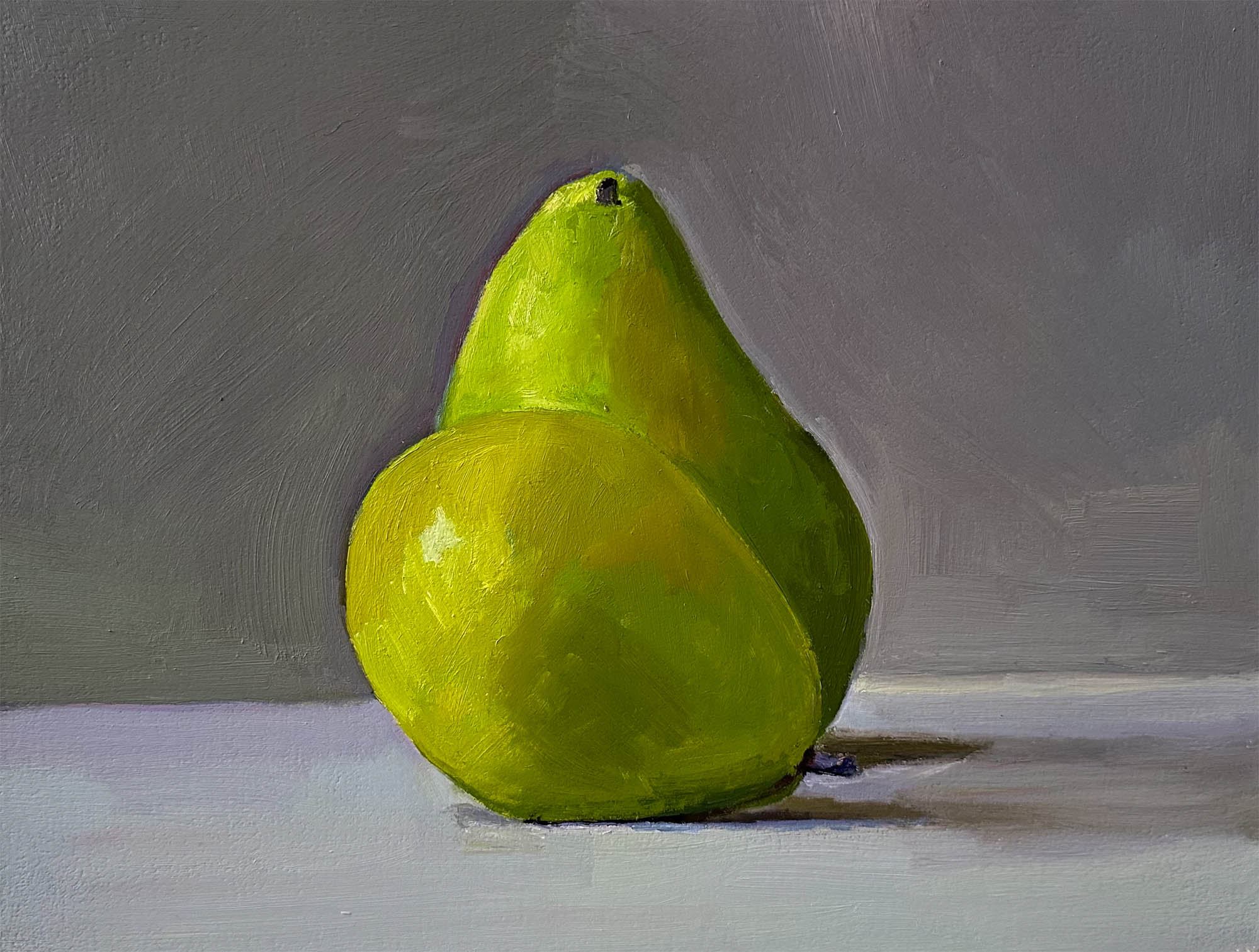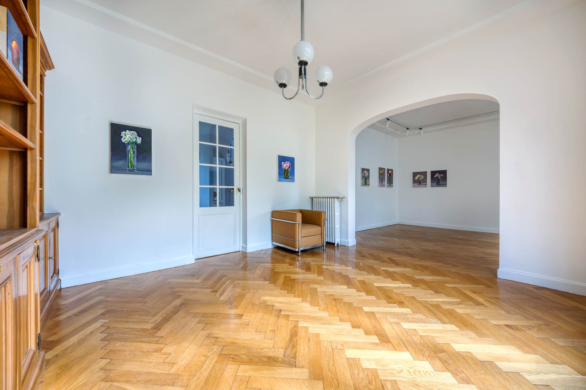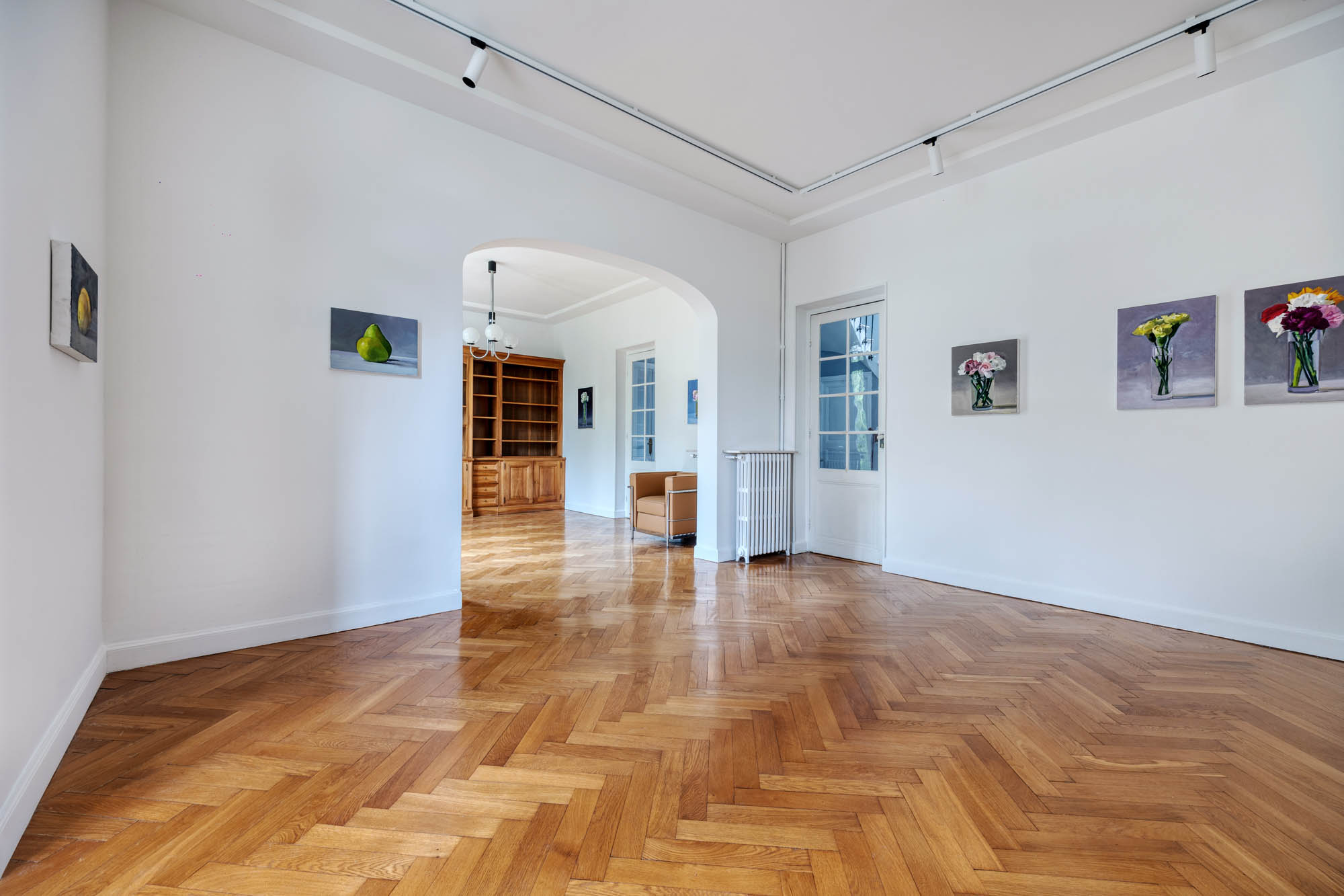 McCleary’s still-life paintings offer a meticulous exploration of form and color. The exhibition presents thirteen intricate floral compositions alongside four smaller fruit studies, each crafted with a minimalist beauty that invites a deep, contemplative gaze. The work pays homage to traditional genre painting, yet McCleary brings a contemporary edge, subtly reinterpreting timeless themes with deadpan precision and a quiet yet resonant emotional power. Every brushstroke is purposeful, stripping the subject to its essence, whether it’s the soft suggestion of a lily or the simple curve of a pear.