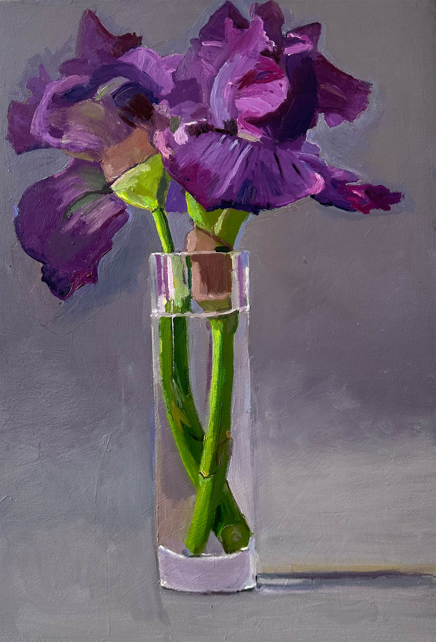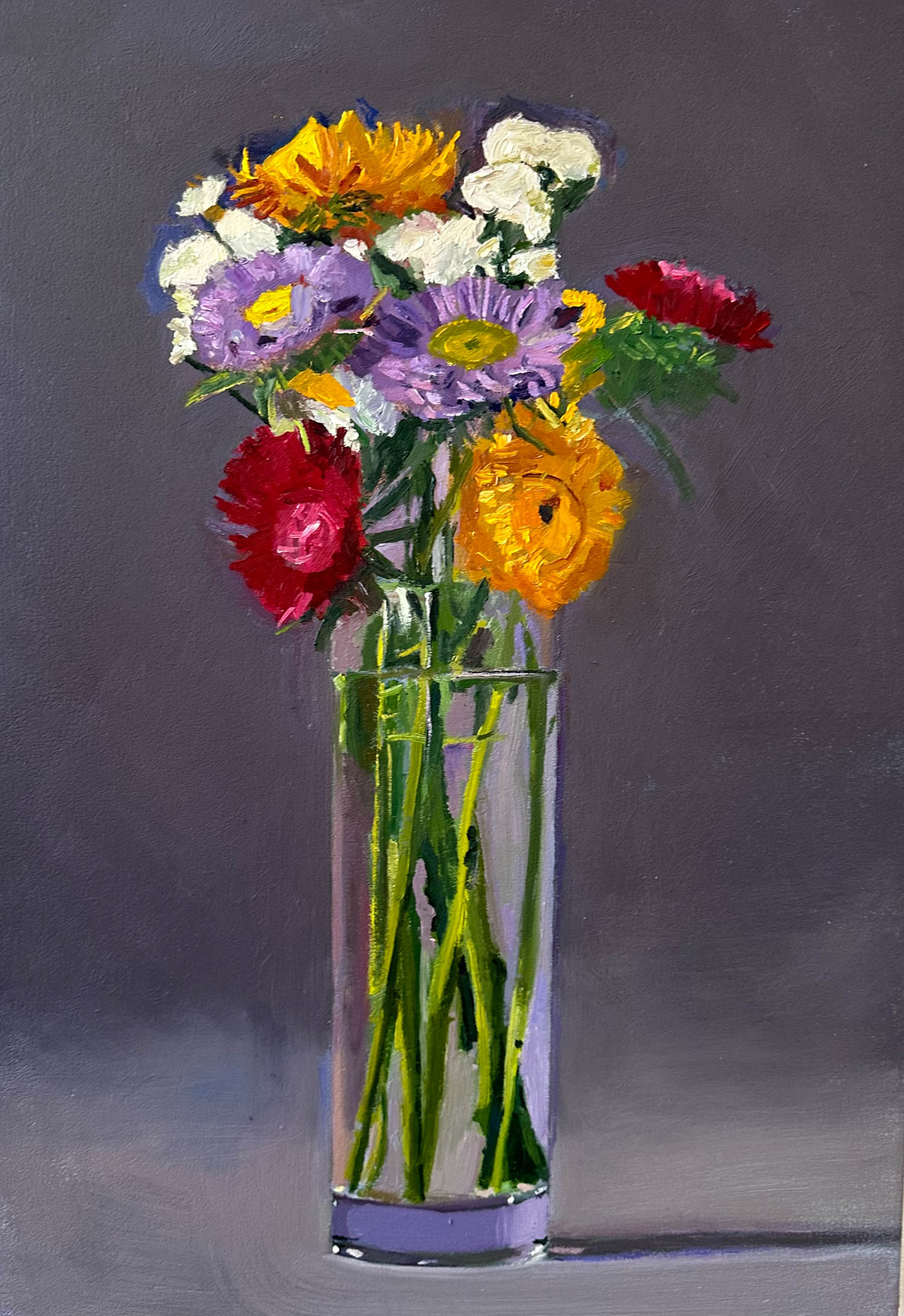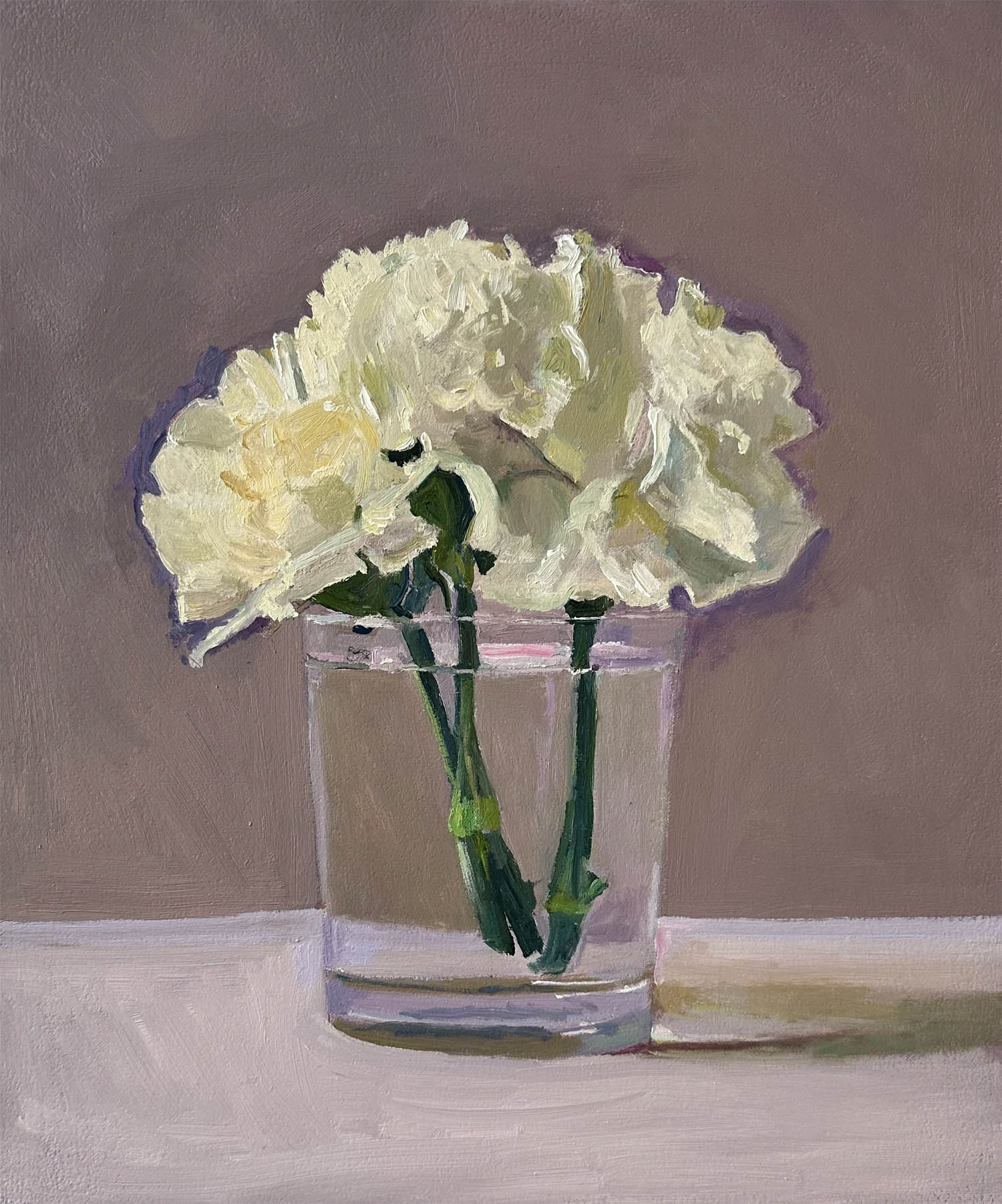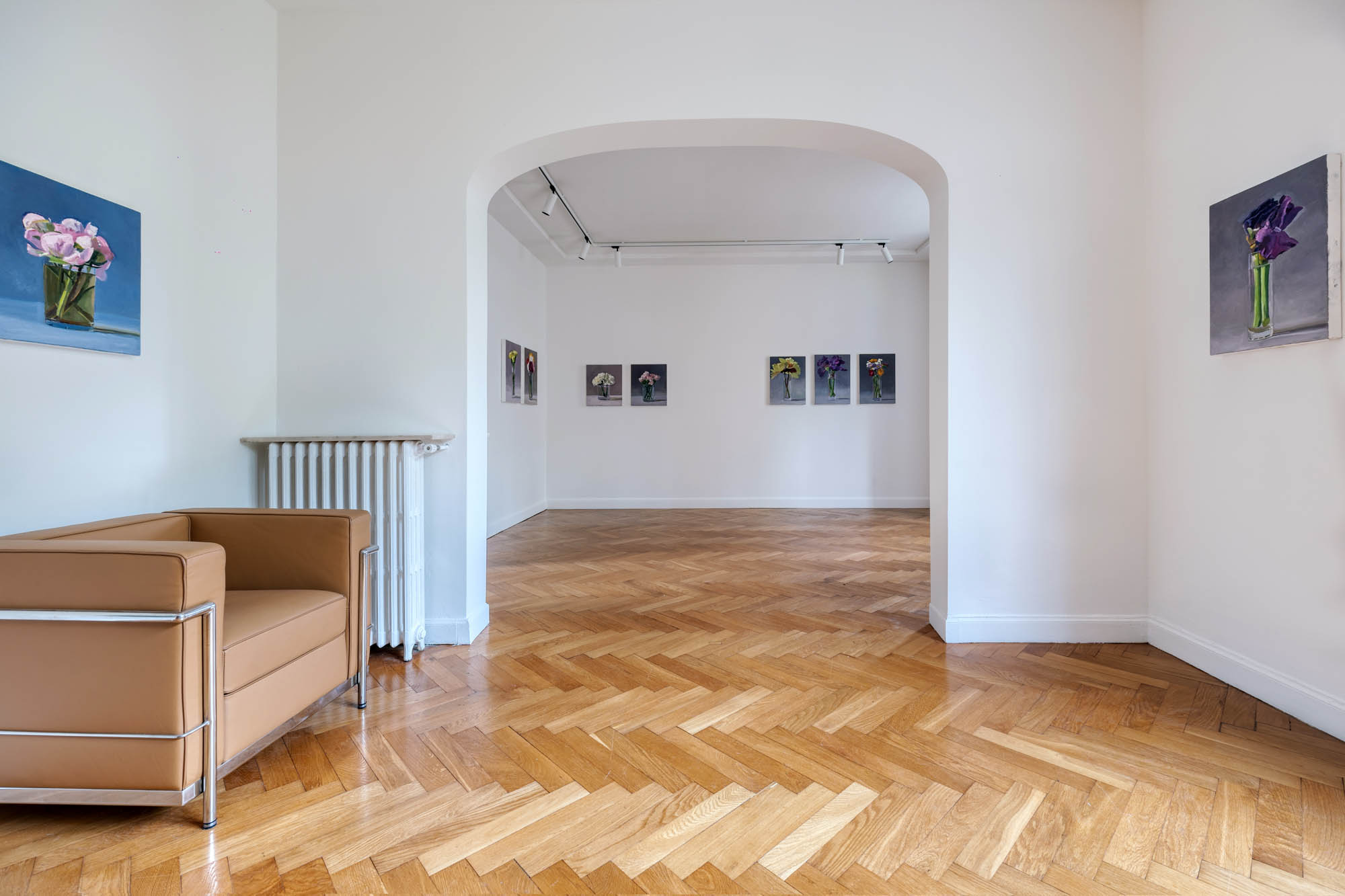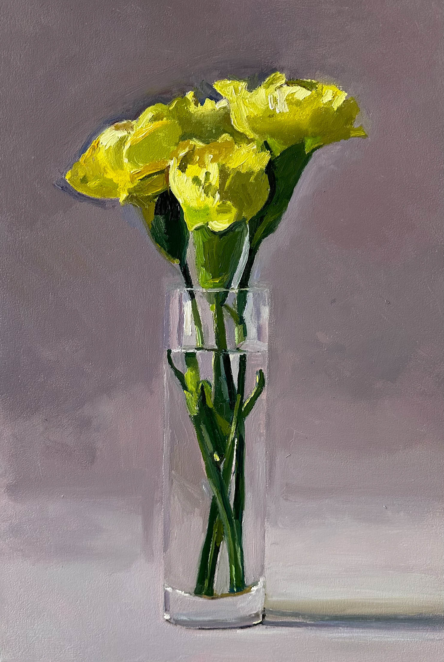 McCleary’s flower arrangements, all set within simple glass vases, evoke a sense of order, yet reveal an emotional depth in their precise execution. These paintings invite viewers to imagine the scents of blooming flowers, the softness of petals, creating a multisensory experience that extends beyond the visual realm.