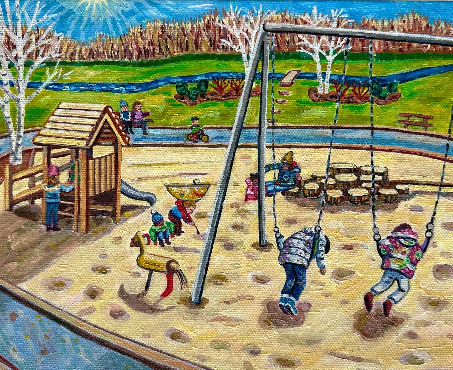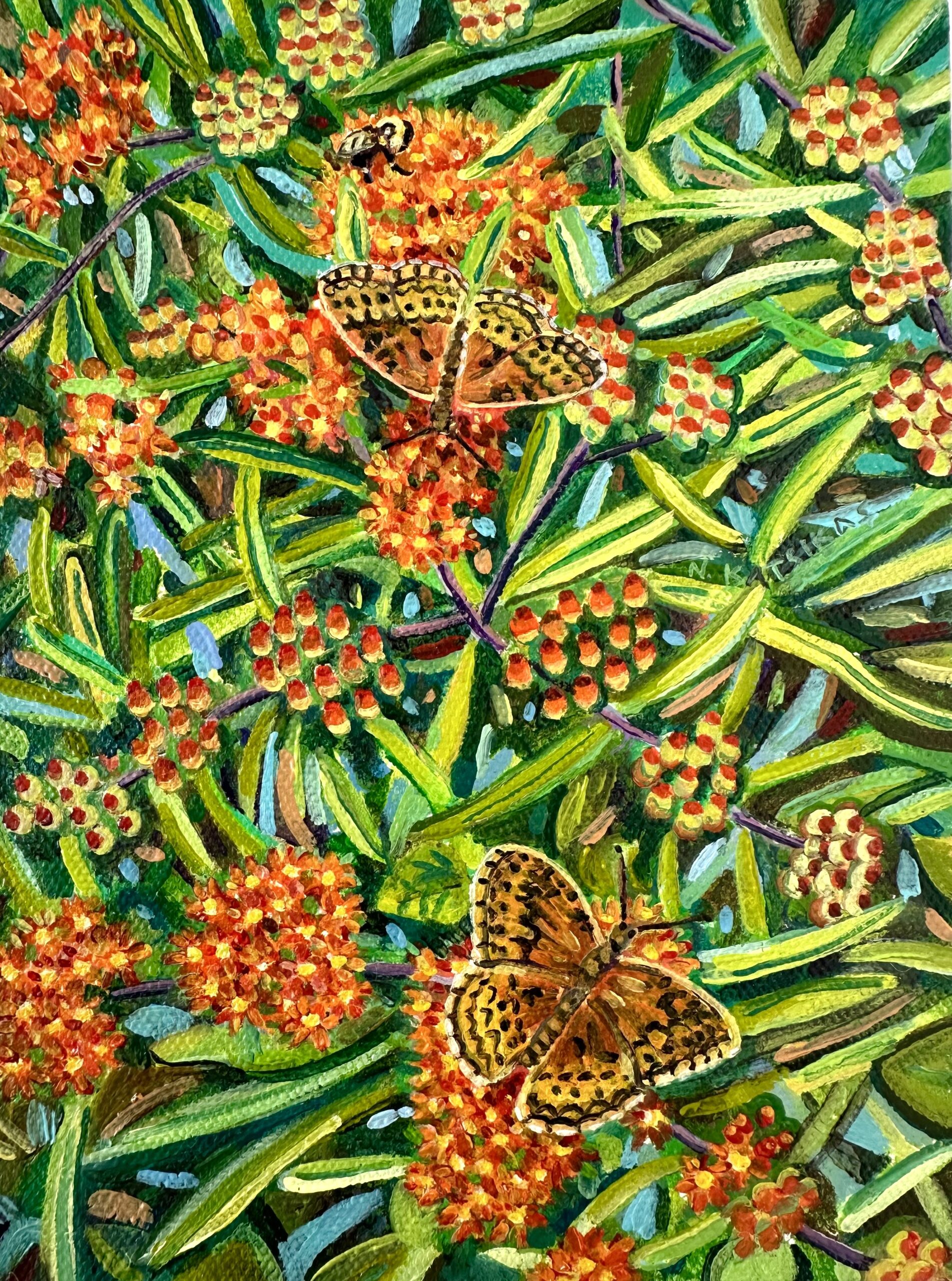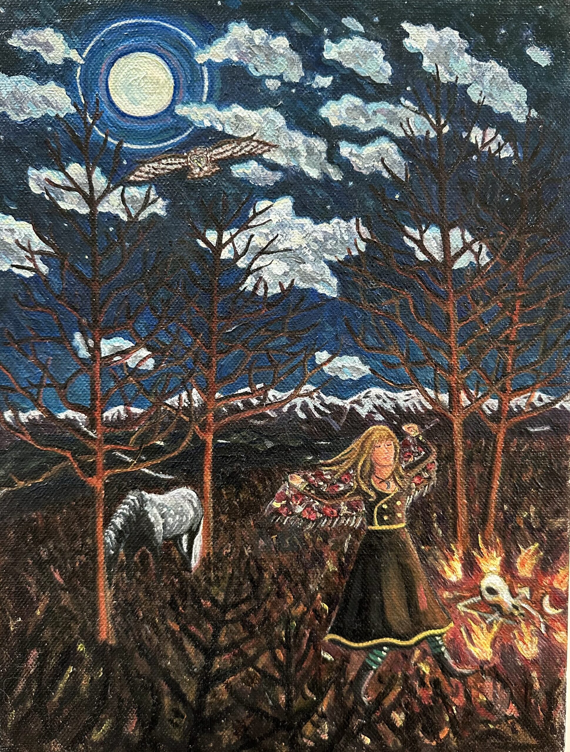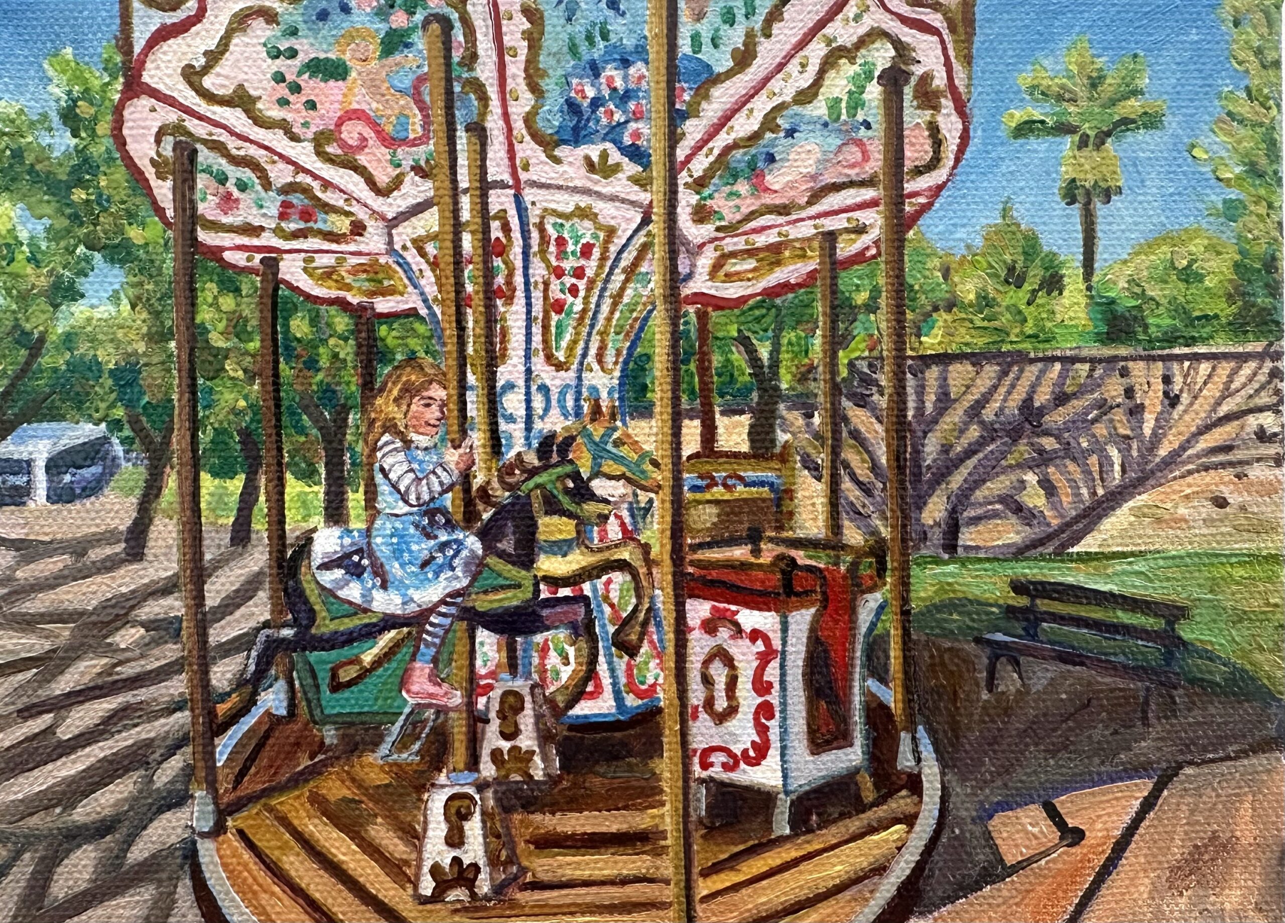 She works on small, almost miniature canvases rendered with meticulous detail, their intensity and independence of touch hovering just at the edge of outsider art without ever fully entering it.